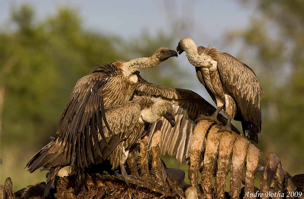 Along with a mate, our vulture has selected an Acacia tree out of reach of the others for her nest to reduce the number of fights with noisy neighbours, allowing her to focus her attention on her chick. Two pairs who chose the same nesting tree squabble at a distance, their young noticeably thin.