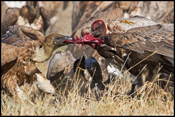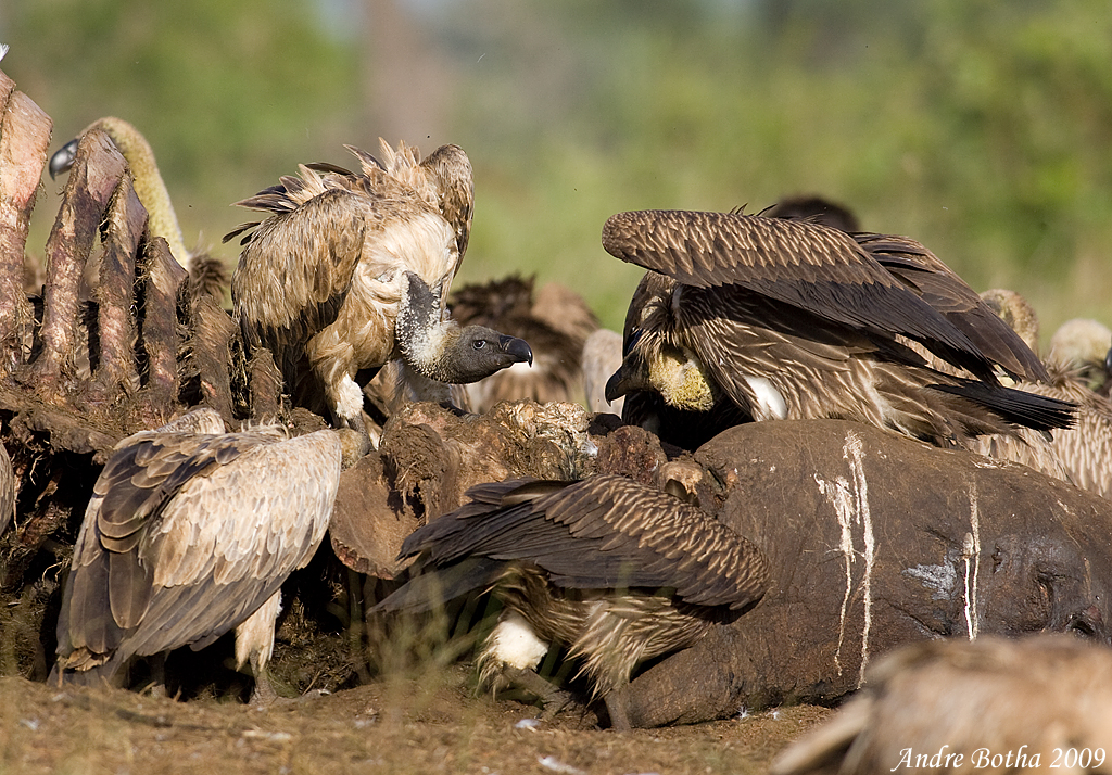 Like the eagle, her actions don’t go unnoticed, and nearby vultures cue to this behaviour, a signal that food has been discovered. Because the birds are concentrated around the roost they end up being concentrated in the air which allows many of them to react to a find. Still, there is a prize for arriving first, the finder’s fee, a portion of food you can eat unmolested. Her preference, like all White-backed Vultures, is for the viscera. But time is of the essence here, so our bird has to gorge while she can, before the rest of the wake arrives.