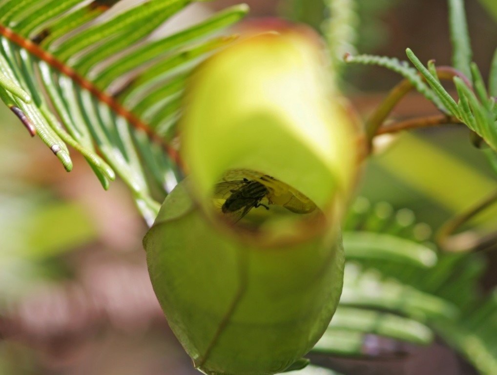 Pitchers secrete nectar around their lids and lips (also known as ‘peristomes’), and visiting insects often slip into their fluids while feeding on this nectar. Slender pitcher plants trap lots of ants this way, but only succeed in trapping flying insect prey occasionally. In an earlier, experimental study, we had shown that the pitcher crab spider ambushes flesh flies as these are feeding at pitchers, and subsequently drops prey carcasses into pitcher fluids after feeding on them. Fortunately, flesh fly carcasses still contain some nutrients after being consumed by crab spiders, and pitchers can benefit from this residual nitrogen. Thus, pitchers which are not inhabited by crab spiders catch fewer prey, but get more out of each, while those which are inhabited ‘catch’ more, but get less out of each.