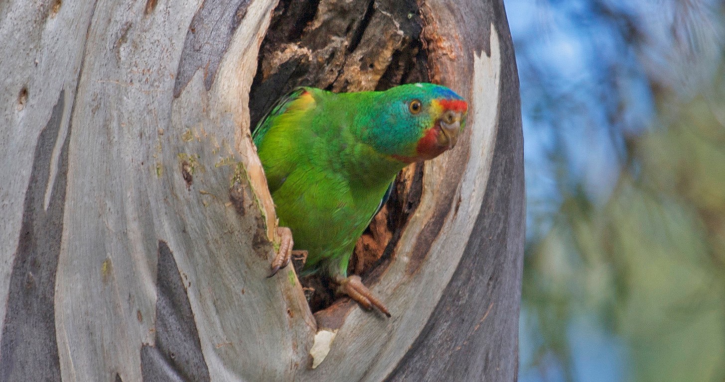 In 2014 we reported that an introduced predator, the sugar glider (Petaurus breviceps), kills large numbers of breeding female swift parrots (Lathamus discolor) in their nest hollows. These small marsupials can access the hollows high in old Eucalyptus trees and kill the female while she is incubating her eggs. Sugar gliders were introduced accidentally to Tasmania in the 19th century but have proliferated in recent times as forests become more disturbed and fragmented. Swift parrots are nomadic and gain a limited reprieve from this introduced predator in occasional years when their food, nectar from flowering Eucalyptus trees, becomes available on predator free islands. On average though, over 50% of adult female swift parrots die each year from sugar gliders leading to a population in freefall with a projected decrease of over 90% in 16 years.