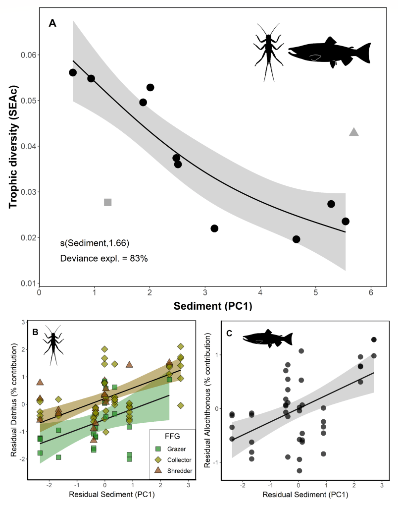 We found that the dominant stressor along the disturbance gradient, fine inorganic sediment, was associated with reduced trophic diversity – stream invertebrates and fish became increasingly equivalent in isotopic niche space (Figure 1A). These changes appeared to be driven largely by a shift towards a food web based on terrestrial inputs including detritus (Figure 1B,C).