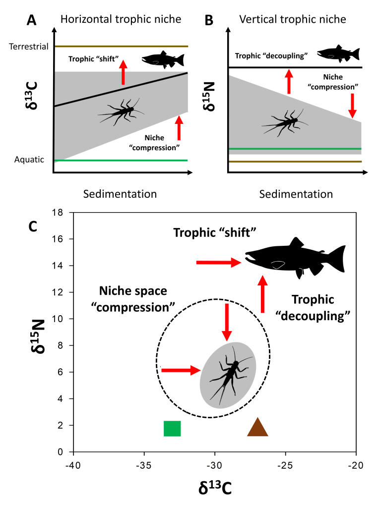 Each invertebrate and fish species were spread out in isotopic niche space, reflecting different ecological roles, or “professions” in their ecosystem consistent with the Eltonian niche. However, this harmonious coexistence appeared to be disrupted by landscape disturbance – along the sedimentation gradient invertebrate and fish species become increasingly equivalent in isotopic niche space (Figure 1A), as the “green” trophic pathway collapsed and was usurped by the “brown” food web channel.