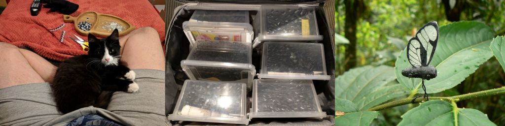 Next, the most exciting part of the study took place, the fieldwork. Well, probably after convincing the panel of two Foundations to grant us the money to run a field experiment testing predation on replicas of glasswing butterflies and damselflies in Colombia. And probably also after manually putting together the 2000 artificial replicas before flying there (Fig.2). We made replicas that looked like butterflies or damselflies perching, and we also added a colouration treatment: without the white wing patch, with an UV-reflective white wing patch, or with a non-UV-reflective white wing patch. Eventually, we travelled to Bogotá, where we joined our collaborators from Universidad de los Andes.