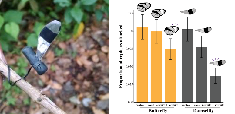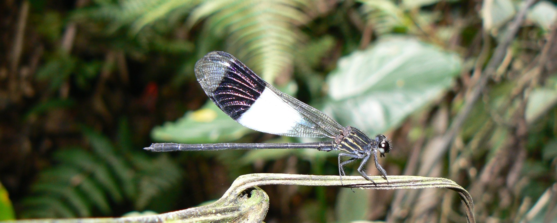 The focus of our study was the “clear wing complex” mimicry ring (a group of species within a local community sharing an aposematic signal). Mainly distributed in tropical areas of Central and South America, this mimicry ring is dominated by glasswing butterflies (Fig. 1). The UV-reflective white patch that these butterflies present on their mostly transparent wings functions as an honest signal of their unpalatability, which originated from accumulated alkaloids. While a white wing patch that reflects ultraviolet is not a common warning signal found in nature, it seems to effectively advertise the message to their main predators (birds) in this habitat. Indeed, many insect species have evolved a similar aposematic signal mimicking glasswing butterflies. Interestingly, among these mimic species, one can find the only family of damselflies known to date to have evolved mimicry, the family Polythoridae (Fig. 1).