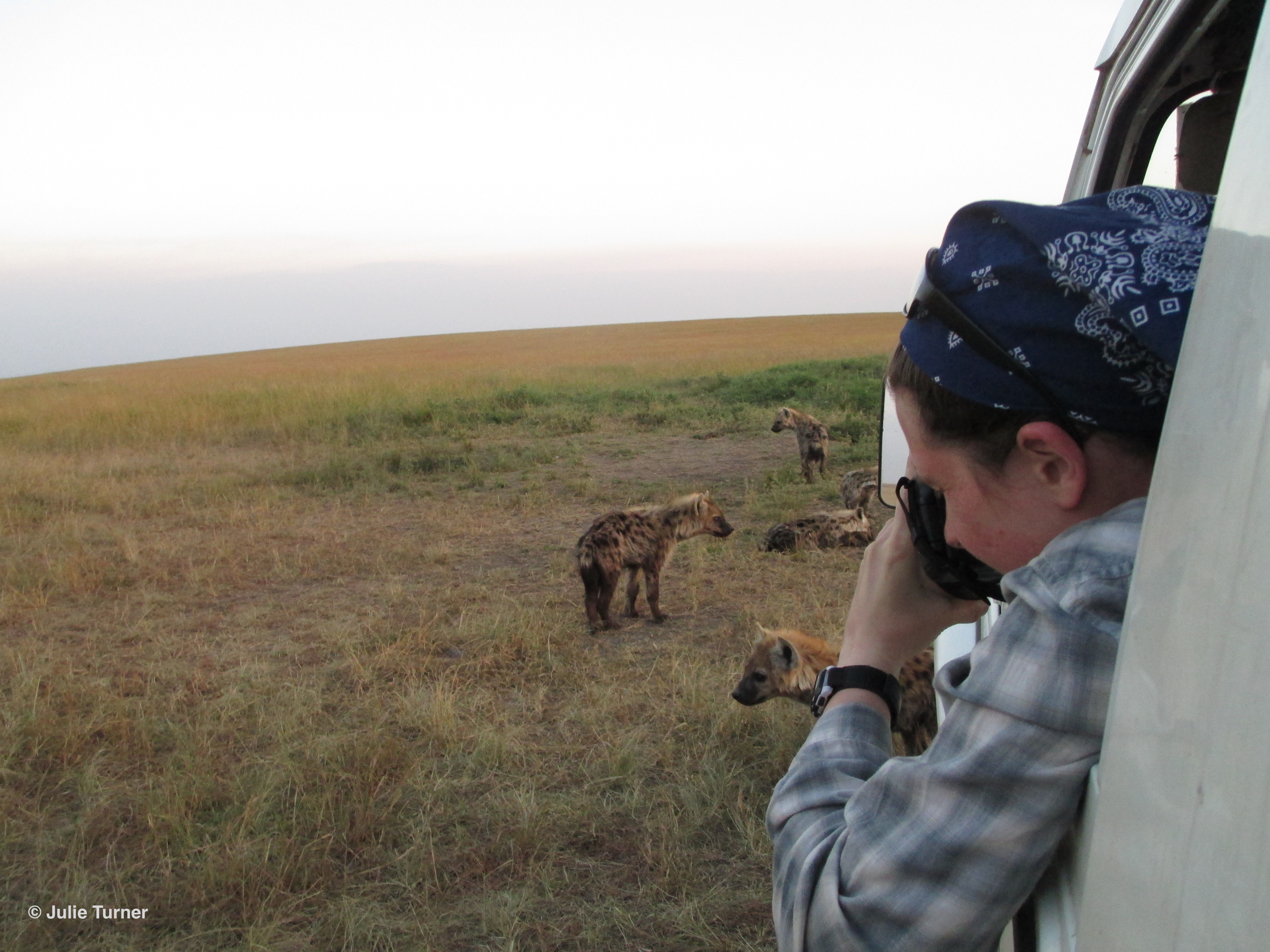 Doing these analyses required us to do lots of field work to get the data. Driving around the Masai Mara every morning and evening, we stop every time we see a hyena. When they are in a group, we note who is there and record most of their behaviors that we see. Some of the most fun times doing this field work is when we sit at the den, which is the social hub of hyena society. There are frequently lots of cubs romping around, playing with other cubs and older siblings, chasing bugs, and nursing from their moms. It is lovely to watch everyone to the sound of insects as the sun rises and sets.