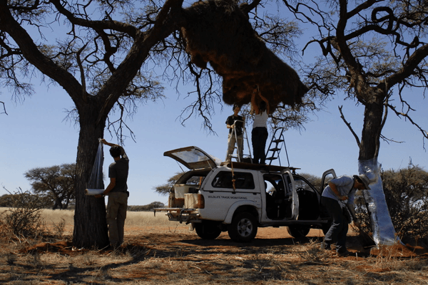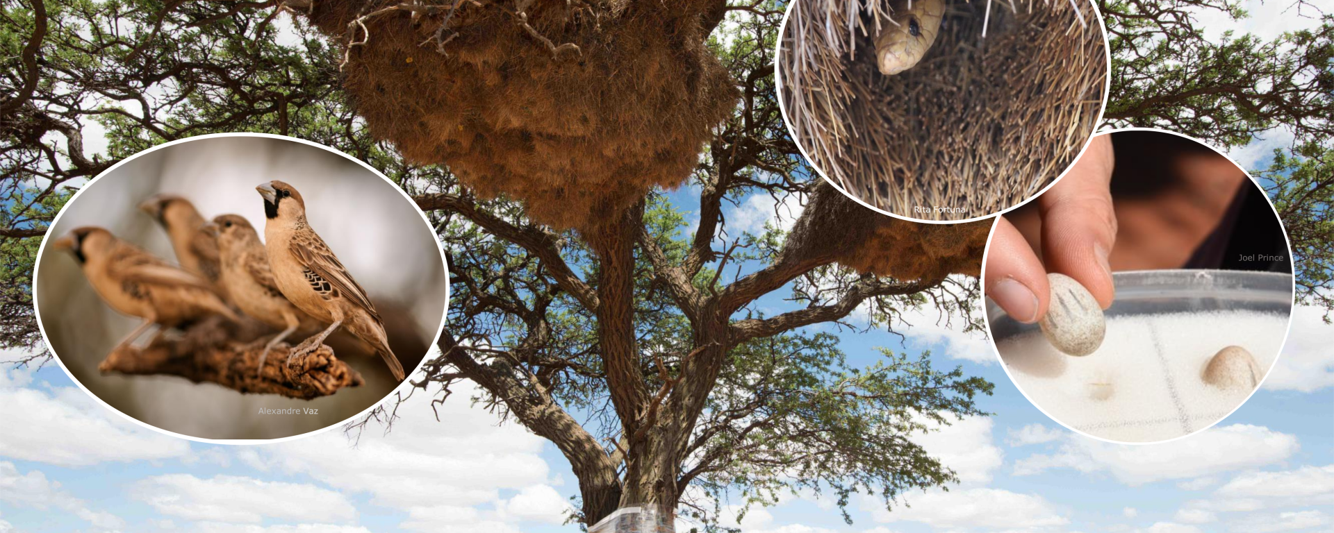 It is hard to breed in the arid savanna, but the resilience of these birds never ceases to amaze us. Besides the harsh climate, sociable weavers face a problem for breeding success that we could not overlook: nest predation. Snakes can depredate around 70% of the breeding attempts (Covas et al., 2008) and some females lay over a dozen replacement clutches. To experimentally manipulate predation, we wrapped some of the colony trees with plastic cling film, which prevented snakes from reaching the nests. This way, we could study how removing nest-predation pressure affects egg-laying decisions.