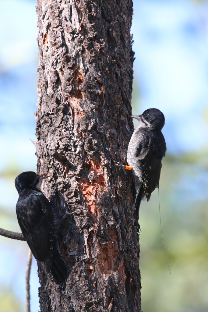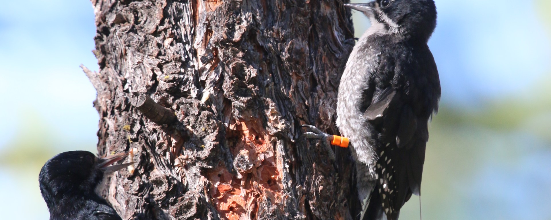 When Andrew Stillman and field crews from The Institute for Bird Populations (IBP) tagged fledgling black-backed woodpeckers (Picoides arcticus) with radio transmitters in the summer of 2016, things did not go as expected. Black-backed woodpeckers are post-fire specialists, and in the western United States are most frequently found in mixed- or high-severity burned forest. But when the researchers hiked into the center of large burns and turned on their receivers to begin tracking the fledglings, the signals quickly led them right out of the severely burned patches into unburned or less severely burned forest nearby. “We were floored,” Stillman said. “We thought that high-severity fire created good habitat for both fledglings and adults, but we consistently found fledglings in areas where plenty of live trees remained after fire.”