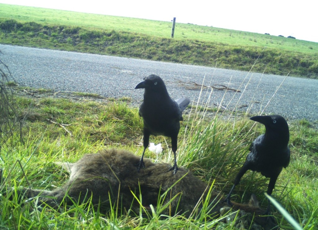 In our recent paper in the Journal of Animal Ecology, we used this naturally occurring experiment to examine how the loss of native carnivores, like the devil and quoll, within a community impacts the use of roadkill by a remaining scavenger, the forest raven. We monitored the locations of roadkill and ravens on eight road transects across four seasons on the Tasmanian mainland and the Bass Strait islands. Unsurprisingly, we found that roadkill was a strong predictor of raven presence along roads in general. However, the effect of roadkill was greater on the Bass Strait islands, where ravens used the resource heavily throughout the entire year. In contrast, ravens were mostly clustering around roadkill on Tasmanian mainland roads in the autumn, when other resources were low. This suggests that under lower levels of competition, ravens can, and choose to, feed on roadkill throughout the year, even in seasons when other resources are readily available.
