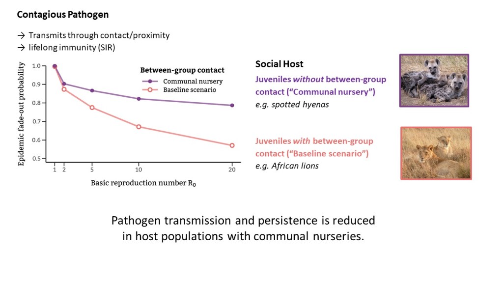 Despite the evolutionary advantages of sociality, such as foraging, predatory defence or thermoregulation, life in groups is often associated with fitness costs associated with an increased risk of pathogen spread. In this context, empirical and theoretical studies showed that pathogens can exert a selective force on social and behavioural traits such as group-size, division of labour, mating systems or even dominance and may thereby play a role in the evolution of social interactions in highly organized societies. However, the effects of communal nurseries on pathogen persistence is unclear, as are the mechanisms explaining the potential benefits of this form of protection against infection, i.e. the prolonged communal housing of young, regardless of their degree of relatedness to visiting adults. Such species include spotted hyenas, yellow-bellied marmots Marmota flaviventris, where all males and most females leave the colony one year after birth, grey wolves Canis lupus, where juveniles stay in communal burrows for six months and begin to hunt, potentially encountering members of other groups after about ten months of age, sperm whales Physeter macro-cephalus, whose calves less than one year old stay at the surface with related females while the mother dives to hunt or Nile crocodiles Crocodylus niloticus which keep their offspring in crèches for about two years.