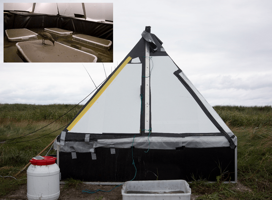 In a recent paper in the Journal of Animal Ecology, we investigated how exploratory behaviour in red knots (Calidris canutus islandica) is associated with foraging tactics and diet by combining laboratory experiments (personality), field observations (foraging tactics), and stable isotope analysis (diet). First, we developed a mobile experimental arena to measure personality, or more specifically exploration speed, in controlled settings. We validated the method by repeated testing of individuals over time and contexts. Exploratory birds in the first trial, were exploratory in subsequent trials too. This setup allowed us to measure exploratory personality at the field site, eliminating the need to bring birds into captivity for long periods of time. After releasing birds within days of their capture, we went to the mudflats to find these same individuals and observe their foraging behaviour in the wild.
