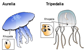 Another cnidarian that has been used to study visual systems is the box jellyfish Tripedalia, which has 24 eyes and is proposed to have 17 opsins. Tripedalia are found in mangrove swamps in Puerto Rico. Using electrophysiology, the spectral sensitivity curves of the lens eyes in Tripedalia and another box jellyfish had a peak at approximately 500 nm. That means that these lens eyes sense blue-green wavelengths of light. In Tripedalia, an opsin referred to as the “lens eye expressed opsin” was found localised to the lens eyes in the rhopalia and is likely the opsin being used to detect the blue-green light. These studies found that these jellyfish are monochromatic which means they cannot tell apart different colours, so how does vision influence their behaviour? One study compared obstacle avoidance behaviour between Tripedalia and another species of box jellyfish found in shallow sandy waters of Australia. The study could not determine whether the two box jellyfish species used colour vision for obstacle avoidance because avoidance was potentially linked to higher contrast. They did find, however, that Tripedalia was better at obstacle avoidance and hypothesized that it has to do with its need to navigate around mangrove roots. Another study sought to find out whether Tripedalia use their large upper lens eyes to navigate. They conducted an experiment were they placed Tripedalia in a circular tank at various distances from their home canopy and found that while the canopy was visible Tripedalia swam towards it.