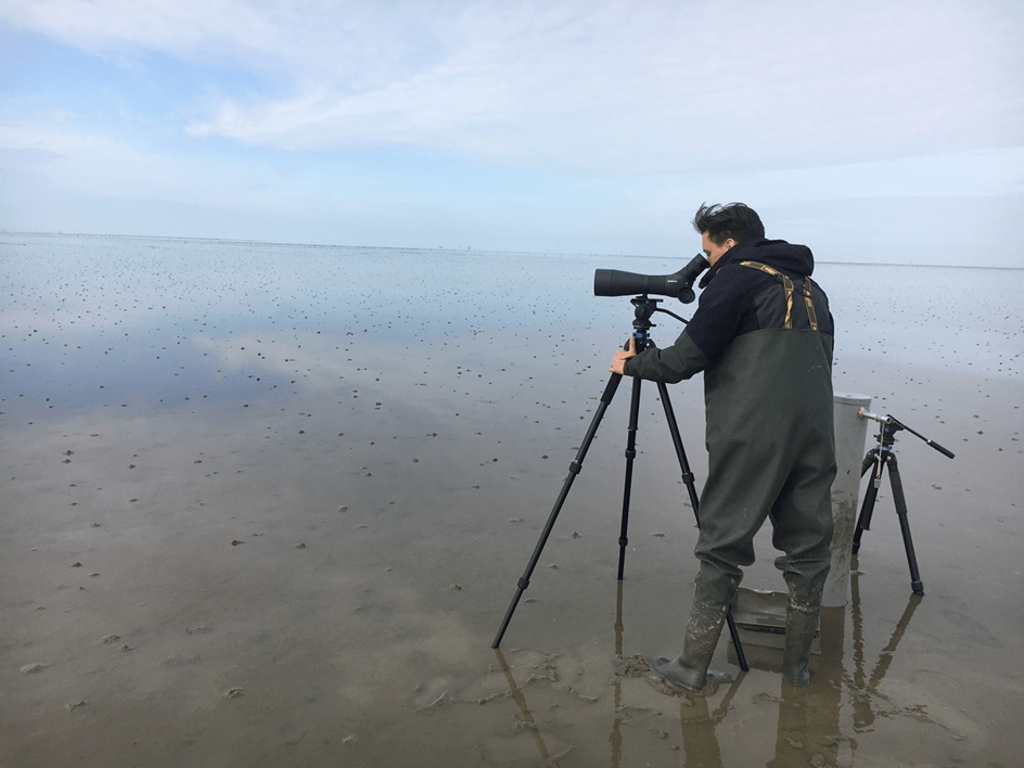 At the moment I’m doing my master’s internship on the migration of Bar-tailed Godwits. The subspecies I’m studying migrate from their overwintering grounds in West-Africa to their breeding grounds in Siberia. A spectacular journey of thousands of kilometres. During this migration, they make a fuelling stop in the Wadden Sea. Here they need to restore their energy reserves before continuing their journey north. Due to climate change, snow melts earlier in the Arctic which means the short food peak is also earlier in the season. Since these birds need to time their reproduction with this food peak, they have to arrive at their breeding grounds earlier and earlier. This could lead to these birds becoming increasingly time stressed which can lead to a lower survival, especially in years with low resource availability. Their fuelling stop in the Wadden Sea is thus really important, and I’m currently looking at prey selection of these birds in this area.