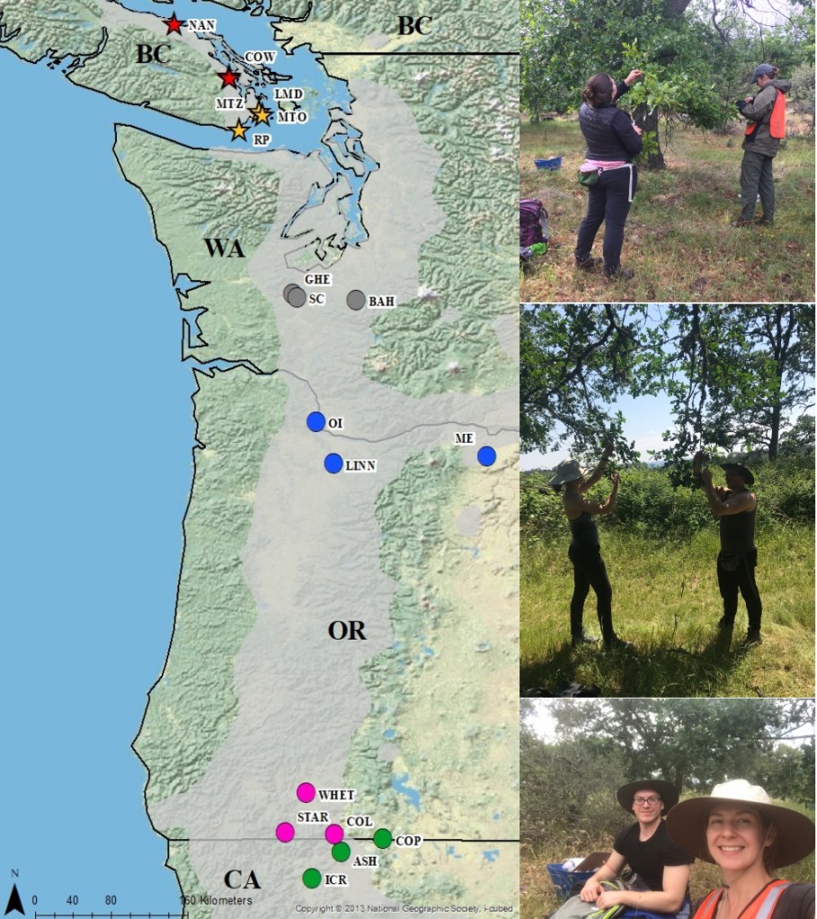 When species undergo northern range expansions in response to environmental and climatic changes, they may encounter less diverse communities. This is because communities commonly experience a loss of diversity at higher latitudes (known as the Latitudinal Diversity Gradient). If low diversity communities have weaker interactions, such as among competitors or predators, range-expanding species may experience “release” from interactions that keep their populations in check, causing them to outbreak or become “invasive.” In our recent paper, Latitudinal gradient in species diversity provides high niche opportunities for a range-expanding phytophagous insect, in the Journal of Animal Ecology, we use a study system of oak gall wasps on a dominant oak, Garry oak – Quercus garryana, in western North American oak ecosystems to uncover if this community shows a reduction in species diversity in northern latitudes. One community member, “The jumping gall wasp” – Neuroterus saltatorius, experienced a range expansion northward and is outbreaking, damaging oaks in its northern expanded range. We ask if lower diversity communities provide weaker competition that might contribute to the jumping gall wasp outbreaking in its expanded range. To ask these questions, with funding from the National Geographic Society, we surveyed gall wasps on Garry oaks throughout most of the tree’s range, from northern California to Vancouver Island, British Columbia. In total, we found and visited 18 sites and found 23 oak gall wasp species.