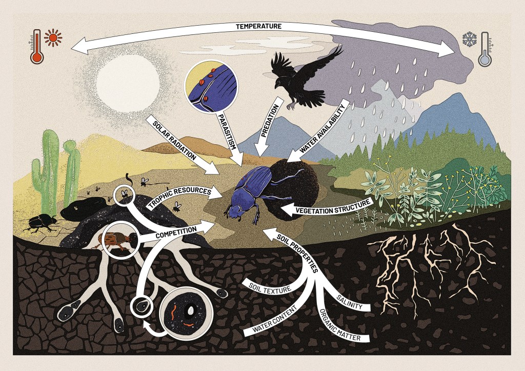 Dung beetles show diverse responses to variations in temperature, water, soil properties, trophic resources, light, vegetation structure, competition, predation, and parasitism. And have key effects in nutrient cycles, bioturbation and plant growth and seed dispersal, besides their large influence on other organisms that live on or use dung, including parasite regulation. Some of them are even pollinators or predators! In total, we identified 66 dung beetle traits, belonging to six categories: morphology, feeding, reproduction, physiology, activity and movement. And we linked these traits to their ecological roles based on known evidence or educated guess, sometimes extrapolating from what is known about other groups of invertebrates. 51 of them act as response traits, 31 as effect traits, and 27 of them act as both. By identifying which act as both response and effect traits, we have been able to determine which traits could change their influence in ecosystems as a response to environmental changes, thus modifying natural cycles. When we put together all the relationships between traits, responses and functions, it is clear that the interactions between the impact of stressors and the delivery of ecosystems services are quite complex. Unveiling this complexity may be key to understanding how global change will alter the functioning of nature as we know it.