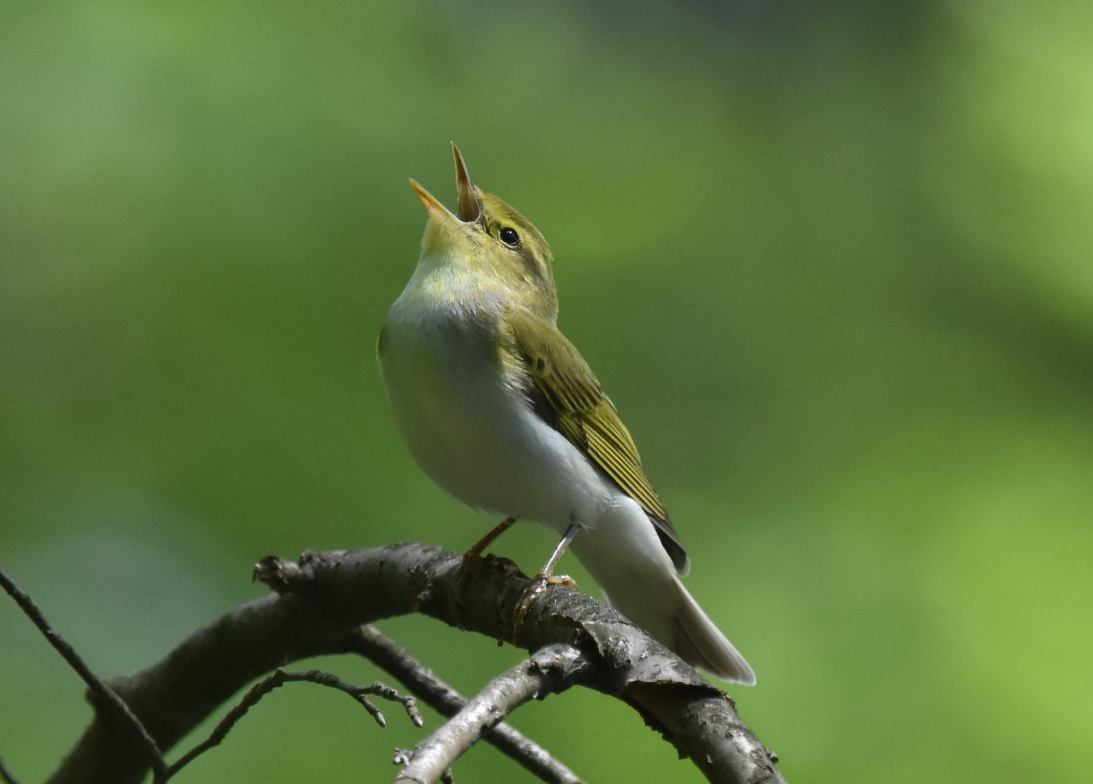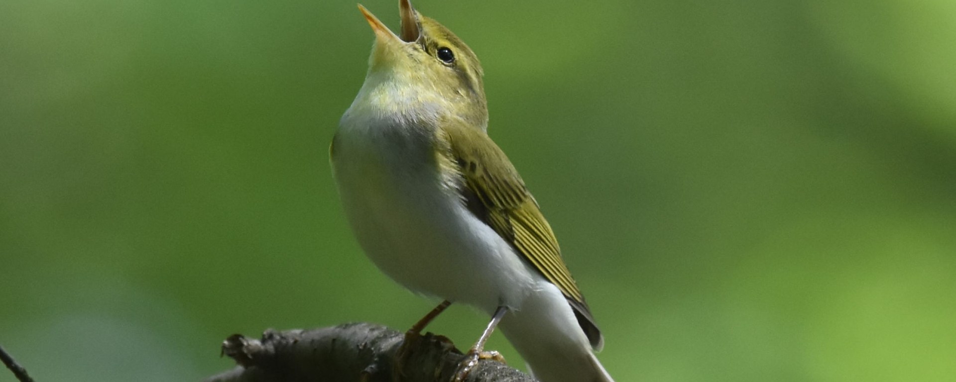 In our study, we investigated conspecific attraction during breeding habitat selection in the wood warbler Phylloscopus sibilatrix. Wood warblers are migratory songbirds that breed in the temperate forests of Europe and spend much of the non-breeding season in sub-Saharan Africa. Weighing in at only 10 grams, these lemon-colored birds sing a silvery trill song that has been likened to the sound of a spinning coin on a marble slab. Natural history accounts often describe wood warblers forming “territory clusters” during the breeding season, and birds have been attracted to settle near speakers broadcasting conspecific song in both Switzerland and Poland. We studied a population of wood warblers breeding in the Swiss Jura Mountains.