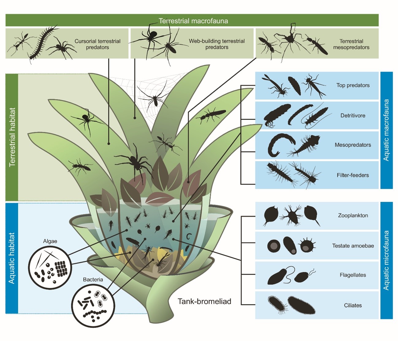 Freshwater environments are susceptible to climate change and biodiversity loss, with high species extinction rates. Given this scenario, there is a critical need for studies that empirically and objectively address the effect of environmental and biotic changes on biodiversity in freshwater systems and their connection with terrestrial ecosystems. However, one of the significant limitations of carrying out empirical studies on the impact of climate change on ecosystems is the difficulty of conducting field experiments (i.e., realistically) while identifying the ecological mechanisms that occur in the system. Tank-bromeliads (Bromeliacea), an almost exclusively neotropical plant, are naturally well-suited micro ecosystems for such investigations as they support a rich fauna of micro-organisms (e.g., bacteria, algae, fungi, and microfauna) and metazoans (multiple groups of invertebrates, mainly arthropods) in a detritus-based food web (Figure 1). Furthermore, tank-bromeliads are composed of two different compartments—the aquatic and terrestrial —which are interconnected by insect emergence used as resources by various terrestrial predators with varying strategies of hunting that use bromeliads as foraging sites (e.g., cursorial and web-building spiders, ants, centipedes) (Figure 1).