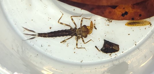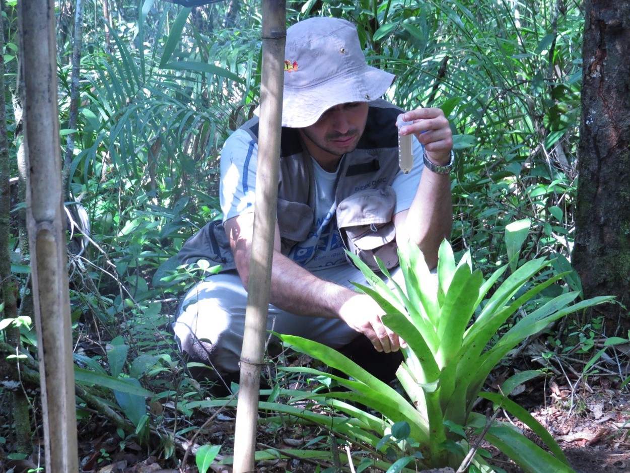 Figure 2. Images from top left to bottom right: 1. Pablo Antiqueira sampling water from tank-bromeliad to evaluate communities of aquatic microfauna and algae community. Photo credits: Gustavo Migliorini. 2-5. Experimental bromeliads in an Atlantic Rainforest understorey, as well as the details of tank-bromeliad top view and the aquarium heaters and temperature sensor inside the tanks. Photo credits: Pablo Antiqueira. 6. A damselfly larva (Leptagrion andromache), a top predator inhabiting tank-bromeliad ecosystem, preying on a beetle larva (Scirtidae, a common detritivore group inhabiting this ecosystem). Photo creditz: Pablo Antiqueira