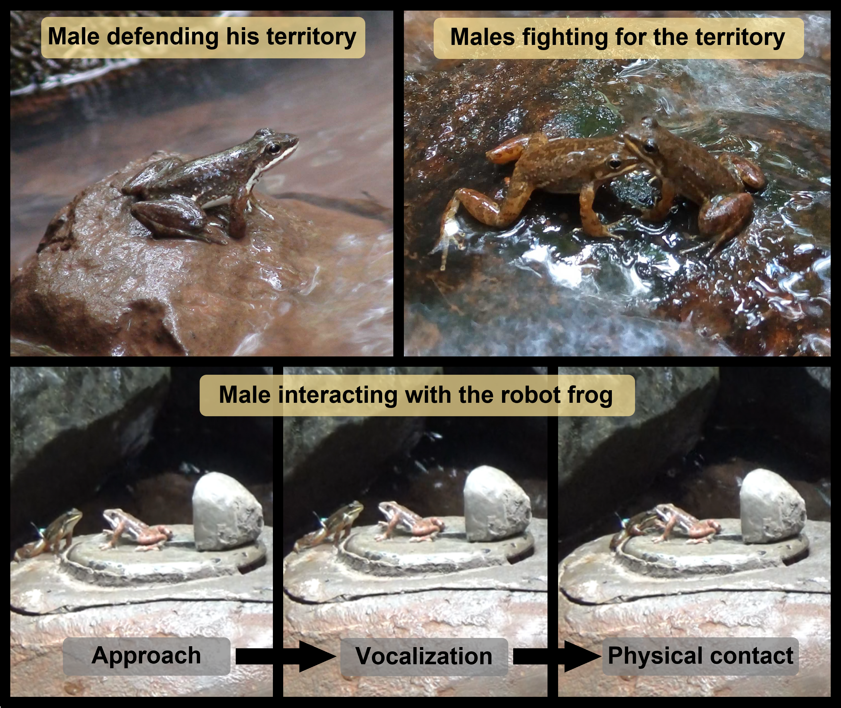 Figure 1. Above, a male Crossodactylus schmidti defending its territory and two males involved in a territorial contest. Below, a male interacting vocally and physically with the robot frog during the experiment.