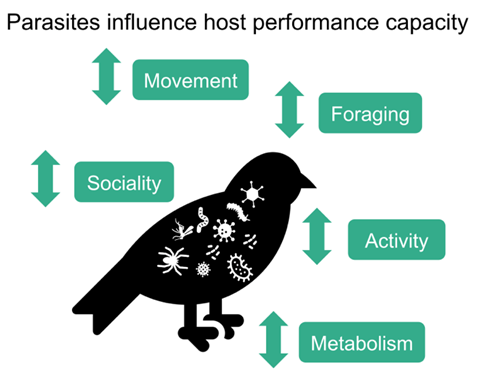 What do we and wild animals all have in common? Parasites! As displeasing as this reality may sound, this fact is often overlooked by researchers conducting experiments on wild animals, either in the lab or on the field1. Parasites are defined as organisms living in or on another species (host) and are deriving resources from their host, harming them to some extent in the process. They are generally associated with a certain disgust, or are sometimes simply too small and considered “irrelevant” to be included in research questions. However, ignoring them could lead to erroneous conclusions, especially in ecology2. For one, wild animals are infected, at different levels, by parasites. Plus, parasites have this amazing capacity to influence their host performance in complex and various ways (Figure 1)3,4.