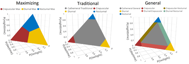 In our paper, we outline three main hypothesis sets (Maximizing, Traditional, and General; Figure 1) that translate the probability of activity during the three fundamental periods of light availability (twilight (low light), daytime (full light), and night-time (no light)) into different diel phenotypes. The three hypothesis sets differ in the objective they aim to accomplish. More so, we implement these hypothesis sets within a model-based framework in the Diel.Niche R package. Researchers can use this package to either classify estimates they have produced from a separate model using the diel phenotypes we have described, or use data directly to estimate support for diel phenotype hypotheses and estimate the probabilities of activity in twilight, daytime, and night-time. Our goal in developing this conceptual and modelling framework is to standardize the language of the diel phenotypes so that we can be confident in describing animal activity across studies.