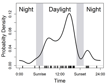 In the last several decades, technologies (e.g., camera-traps and GPS-telemetry devices) have advanced dramatically to allow researchers to observe activity levels of wild animals continuously throughout the day. This has led to new opportunities to better understand species’ activity and especially how their activity changes due to biotic and abiotic factors, such as climatic season, landscape context, human activity and infrastructure, and species interactions. The development of our work, “A model‐based hypothesis framework to define and estimate the diel niche via the `Diel.Niche’ R package”, was motivated by what we saw as a missing conceptual piece to make inference on animal activity comparable across studies. Specifically, we saw a disconnect between animal activity inference (e.g., probability of activity during certain hours of the day) and terms like diurnal, nocturnal, crepuscular, and cathemeral, which ecologists and evolutionary biologists have long used to describe the expression of observable diel behaviour. What proportion of time should a species be active at night to be considered nocturnal? If a species spends 60% of their time active during the day, does that mean they are diurnal? Further, can we make probability statements about how certain we are of a species’ diel classification? It is questions like these that we set out to answer when we made the `Diel.Niche` R package.