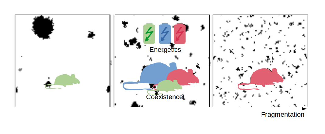 To understand coexistence better and to investigate, which landscapes promote coexistence best, we analyzed community dynamics of small mammals in different landscapes. Since we did not want to see little voles starve in our experiment, and because it is not easy to design their food landscape in nature, we conducted this study using a computer simulation model (Fig. 2). This model simulates the individuals of ten species moving through a landscape of cells that either contain food or do not contain food. The composition of how the cells with food are distributed is described by the degree of fragmentation. Low fragmentation means that the food cells are more clustered together, and high fragmentation means that the food cells are more dispersed and isolated in the landscape. The small mammal individuals forage in the landscapes and then use the energy they gain by this for survival, digestion, movement, growth, and reproduction. More than any real animal would ever tell us, the model can actually tell us how much energy each individual spent on these different processes. To ensure that the model produces realistic dynamics, we compared some model outputs with real data and luckily saw that it reproduces realistic activity ranges and energy rates.