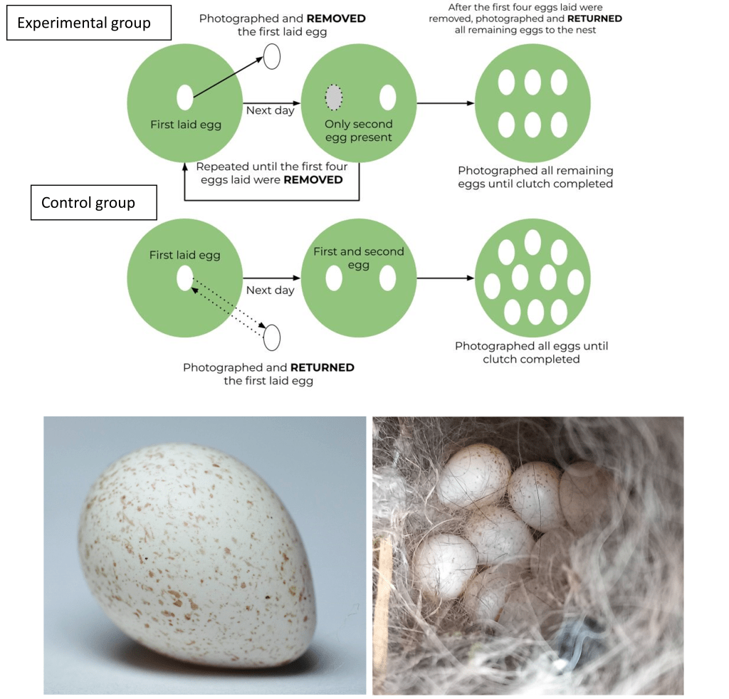 Our study builds on several previous egg removal experiments which have been used to experimentally manipulate egg production in birds. In egg removal experiments, it has been shown that blue tit females produce two additional eggs following the removal of the first four eggs. Thus, if the number of eggs blue tits lay in urban habitats is constrained by the urban environment, we expected urban females to produce fewer, or no, new eggs after egg removal when compared to the non-urban population. If urban blue tit females are not constrained during egg laying, with their small clutches potentially being an adaptive response to urbanisation, we predicted that both urban and non-urban females would lay new eggs after egg removal to keep as close as possible to the optimal clutch size for their respective habitats. Therefore, in a single breeding season in 2022, we removed the first four eggs laid in the experimental nests of urban and forest blue tits and observed how the birds responded to this manipulation (Figure 2).