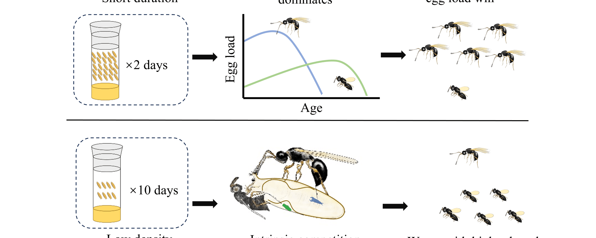 My interest in the interaction between Drosophila flies and their parasitoid wasps grew after I joined Prof. Xi’s lab for postdoctoral research. This shift in research focus was a significant decision for me, and so far, it has proven to be the right one. Drosophila-parasitoid interactions are a key research theme in Prof. Xi’s lab. Tiantian Liu, a master’s student in the lab, discovered that when two parasitoid species with distinct life-history traits compete for the same Drosophila hosts, each species excels at different host densities: one thrives at high densities, and the other at low densities. While much research has been done on how spatial resource distribution affects competition between natural enemies, less is known about how temporal resource variability—i.e., the same amount of resources exposed to consumers for different lengths of time—impacts the fitness and competition between species. Given the importance of fluctuating resource availability in natural ecosystems, both Prof. Xi and Prof. Sun encouraged me to explore this fascinating topic. After discussions with Prof. Xi, we decided to investigate whether the short-lived, proovigenic parasitoid Trichopria drosophilae and the long-lived, synovigenic parasitoid Pachycrepoideus vindemiae, dominate competition under conditions of high host density over short periods and low host density over long periods, respectively.