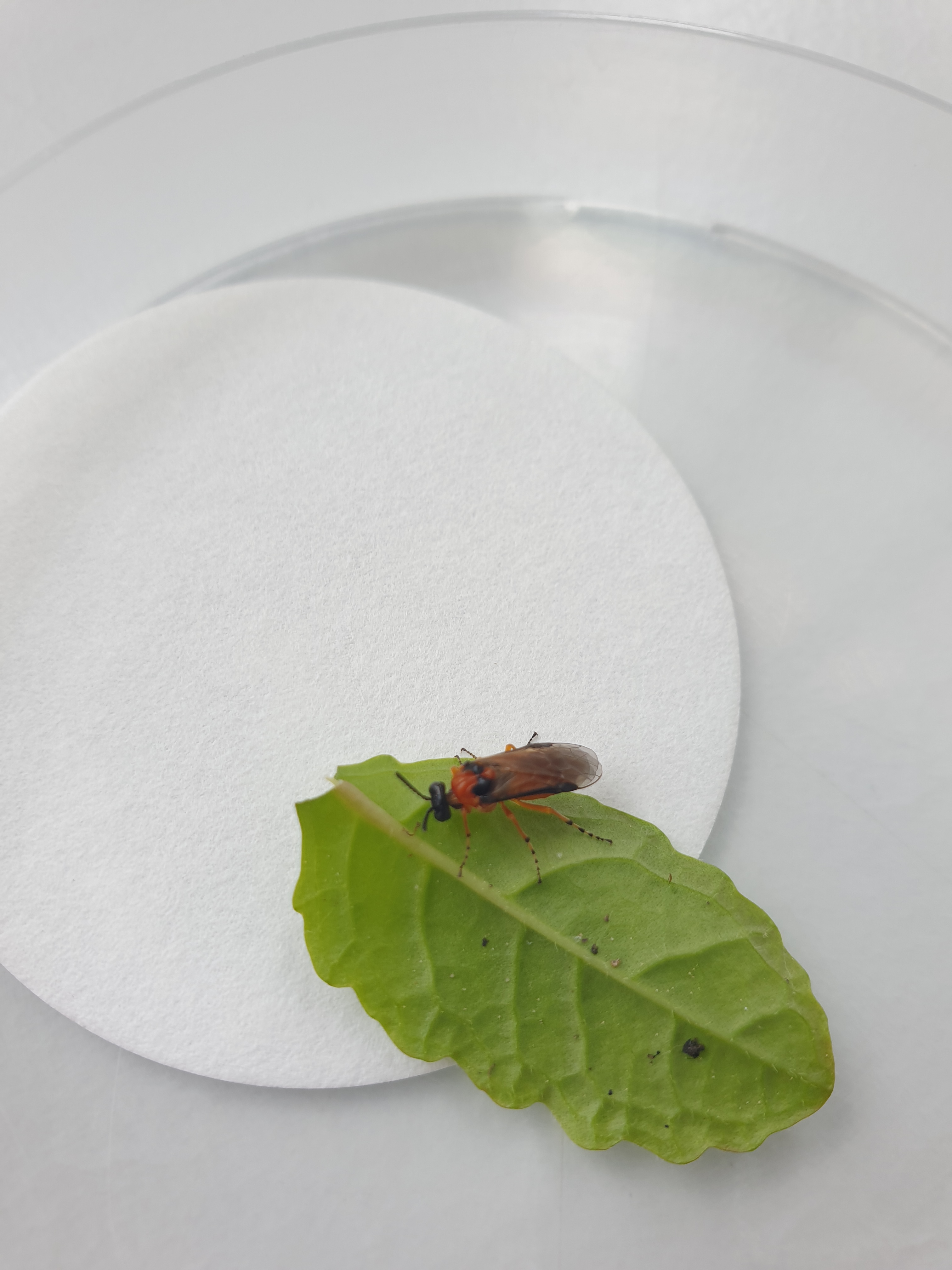 Our recent study in Journal of Animal Ecology explores this fascinating aspect of plant-insect interactions using the turnip sawfly (Athalia rosae) as a model. Turnip sawflies do not just feed on plants; the adults also engage in pharmacophagy, where they take up chemicals (clerodanoids) from non-food plants such as Ajuga reptans. These chemicals provide a dual function: they serve as a defence mechanism against predators and influence the complex social interactions within sawfly populations. Interestingly, clerodanoids can also be transferred from one sawfly to another through direct contact, such as “nibbling” behaviour between conspecifics, thus impacting not only the chemically-armed individual but also its social group.