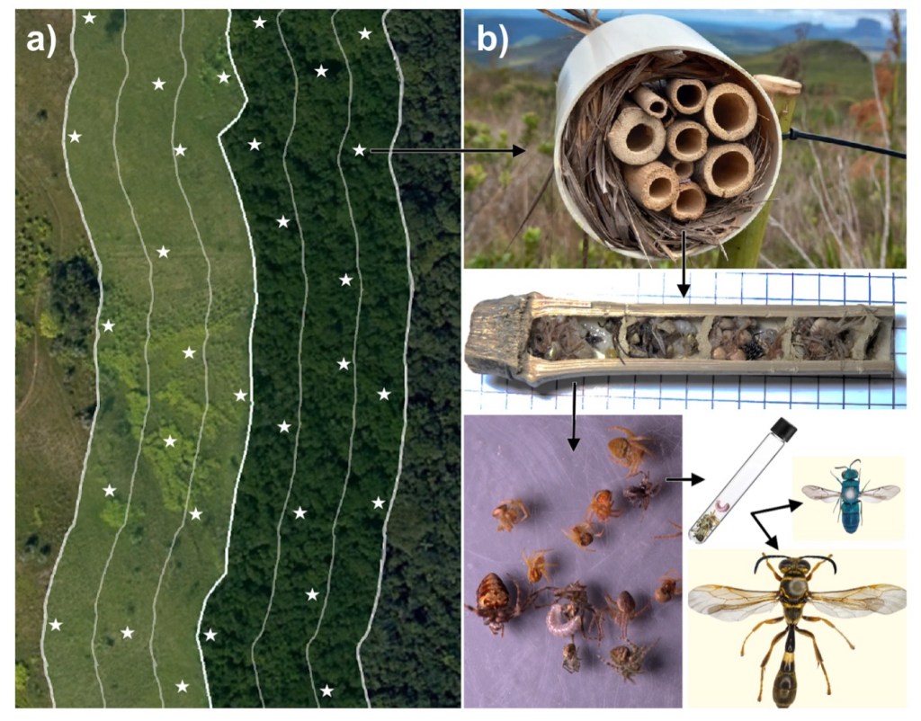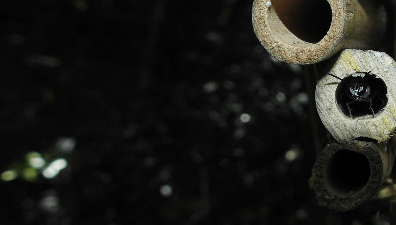 Essas vespas nidificam em cavidades naturais pré-existentes, como aquelas deixadas por larvas de besouros e animais semelhantes. Nos aproveitamos dessa estratégia ao instalar “postes” contendo caules ocos de bambu — os quais são prontamente ocupados por fêmeas procurando por ninhos, e então provisionados com as presas paralisadas, para que seus filhotes consumam as presas ainda vivas. Após a conclusão do ninho, aparecem os parasitoides — que ovipositam dentro dos ninhos, efetivamente roubando os recursos coletados pela vespa construtora. Em seguida, nós entramos na equação: coletamos e abrimos esses ninhos, revelando as interações consumidor-presa e hospedeiro-parasitoide no “unboxing” ecológico mais brutal que você poderia imaginar.