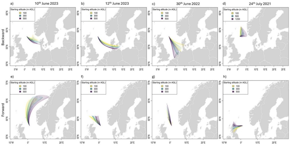 Utilising a weather model referred to as HYSPLIT (Hybrid Single-Particle Lagrangian Integrated Trajectory) we were able to model the likely wind trajectories that these hoverflies took to arrive at the oil rig, and importantly the likely forward movements of these hoverflies when they left the oil rig. The HYSPLIT analysis revealed that origins of northward migration were from the Netherlands, northern Germany, and Denmark, all over 500 km away from the oil rig. Whereas, during southward migration, the results suggested that these hoverflies travelled from Norway. Forward trajectory analysis, determining where these hoverflies might end up after leaving the oil rig, suggested potential destinations including Norway or the Shetland Islands around 250 km away for the northward and Scotland for the southward migrations. Interestingly, in most cases Craig reported hoverflies appearing to stay on the oil rig for up to 12 hours, suggesting that they were using it as a pit stop on their 700+ km trip across the sea.