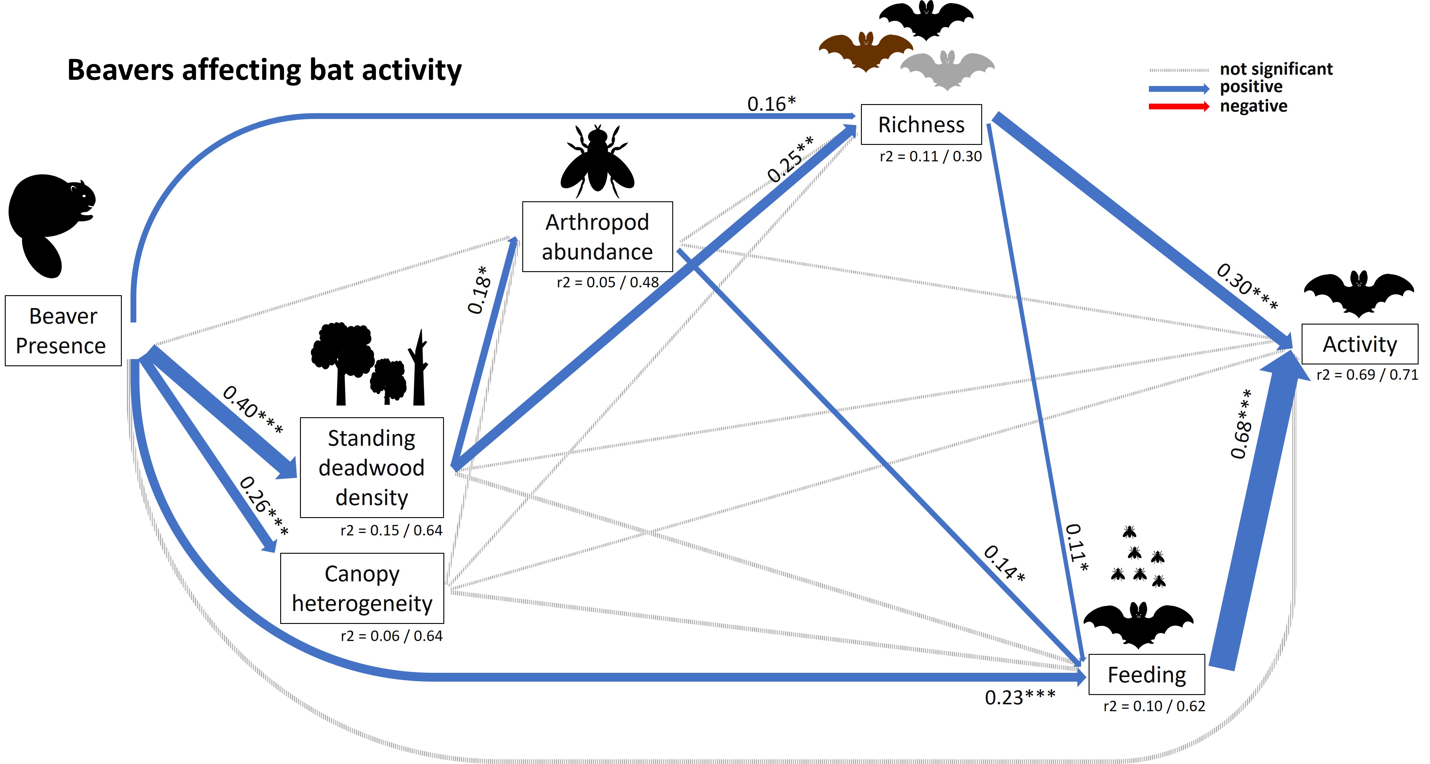 We found strong positive links of beavers to the two variables indicating habitat heterogeneity, standing deadwood volume and canopy heterogeneity. The standing deadwood was then also positively linked to arthropod abundance, which was positively linked to bat feeding. There was also a direct positive link from standing deadwood density to bat species richness. Bat species richness and feeding together then explained total bat activity. Some positive direct links between beaver and bat richness and feeding indicate that our model does not include all beaver habitat modifications important to bats, for example open water area or edge habitat could also be of importance.