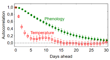 It is known that in a boreal climate, the development of any spring process—snowmelt, leaf budding, insect activity and their consumers—depends on temperature. Crossing a threshold provides the initial impetus, the accumulated temperature sum determines the rate of development, and then it proceeds independently, according to its own schedule. Thus, sequentially, one after another, all spring processes are initiated, including those that determine food availability for birds. The combination of parallel phenological processes forms the environmental phenology. It depends on the temperature of the previous period, although long-standing deviations are gradually “forgotten.” The same is true for the future: environmental phenology predicts development, but the accuracy of its results decreases over time.